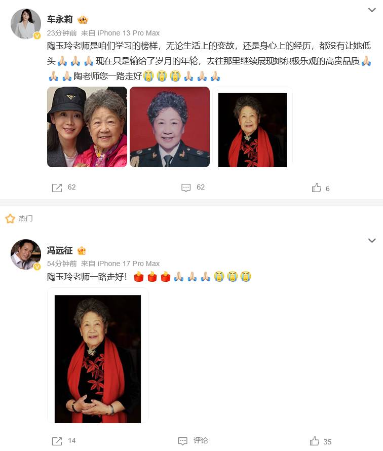 演员车永莉、演员冯远征也分别发文悼念陶玉玲。