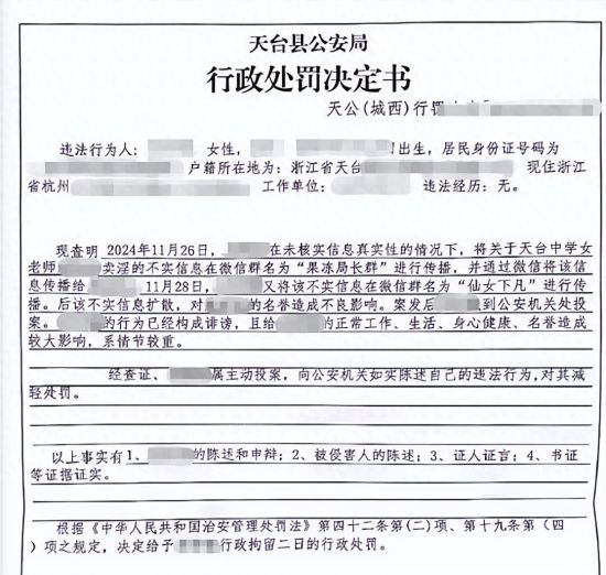 2024年11月,一则关于浙江台州天台县某中学女教师“卖淫被抓”的传言在微信群中流传,后被天台县公安局确认不实。因在两个三人微信群及与两位好友的微信私聊中谈及该传言,林淼被处以行政拘留两日。