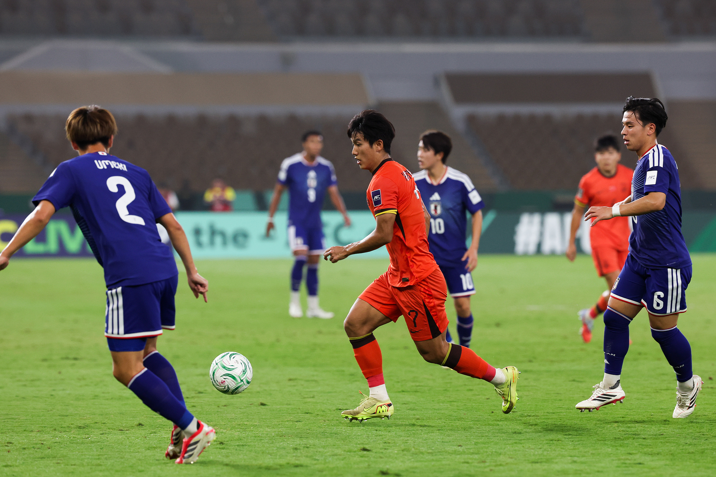 数据统计显示,上半场日本队占据明显优势,控球率56%,射门8次射正4次,而中国队只有2次射门和1次射正。