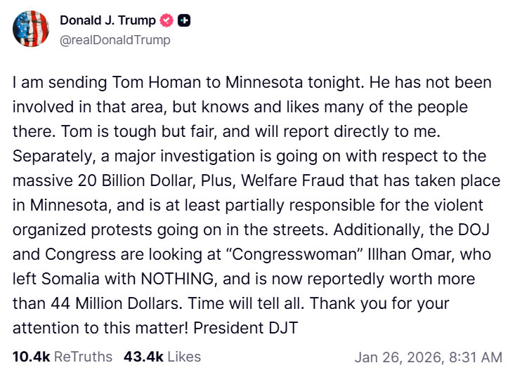 总统川普周一通过Truth Social宣布,他将派遣边境主管霍曼前往明尼苏达州