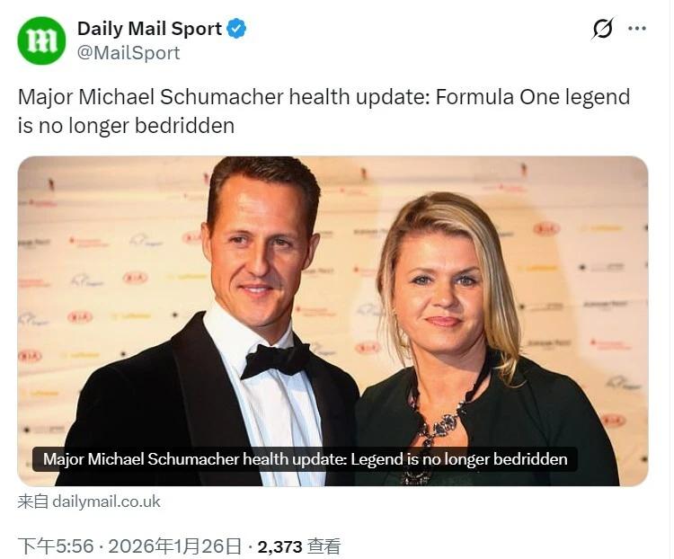 1月26日,据英国《每日邮报》的独家消息来源,此前遭遇重大滑雪事故的F1车神迈克尔-舒马赫,现在已经不再是卧床不起的状态。这是舒马赫遭遇事故13年以来,首次被爆出健康状况的重大更新。