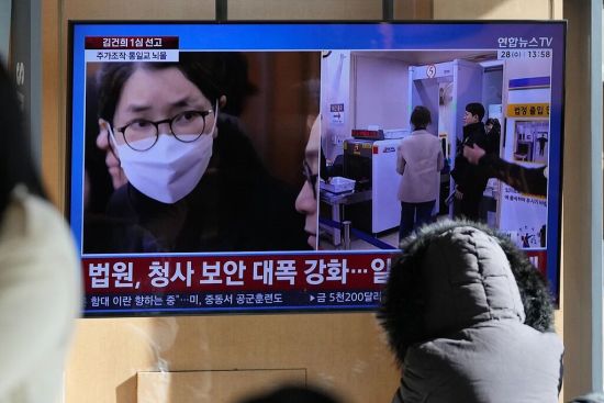 当地时间2026年1月28日,韩国首尔火车站,电视屏幕上播放着金建希的资料画面。图/视觉中国