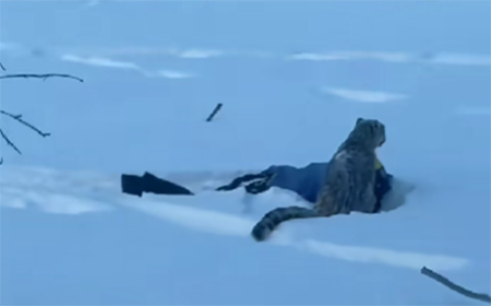 综合多家媒体此前报道,1月23日,新疆可可托海景区宝石沟附近发生雪豹伤人事件。网传视频显示,一名身穿紫色滑雪服游客躺在雪地,身旁有雪豹警惕观望。