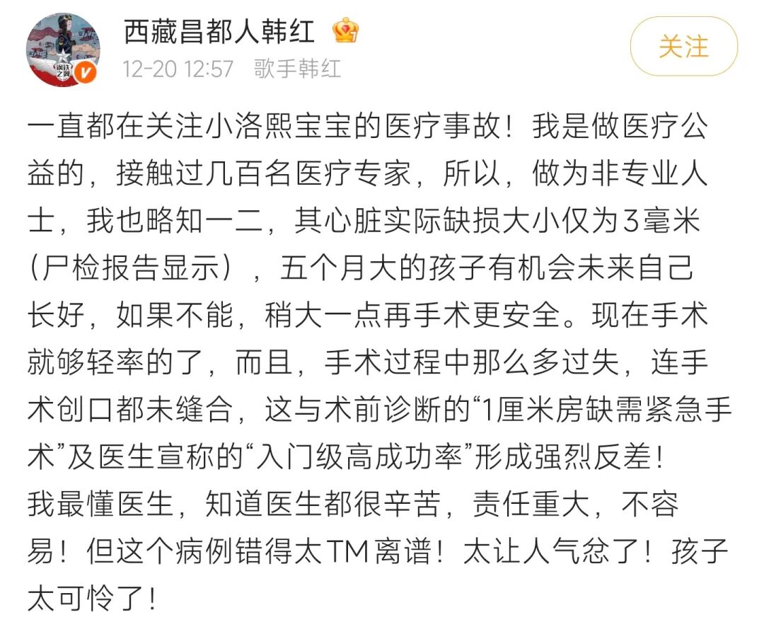 韩红表示,她最懂医生,知道医生都很辛苦,责任重大,不容易!但这个病例错得太离谱!太让人气忿了!孩子太可怜了!