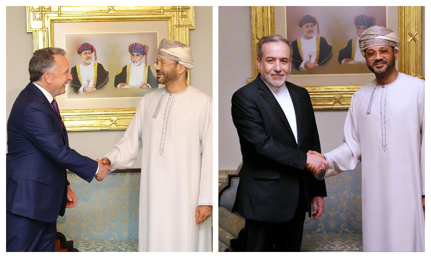 阿曼外交大臣分别与美国特使维特科夫、伊朗外长阿拉格奇握手(美联社)