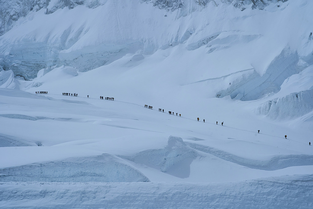 2025年5月1日,尼泊尔,登山者们在前往珠穆朗玛峰峰顶的途中攀登至第二营地。(视觉中国)