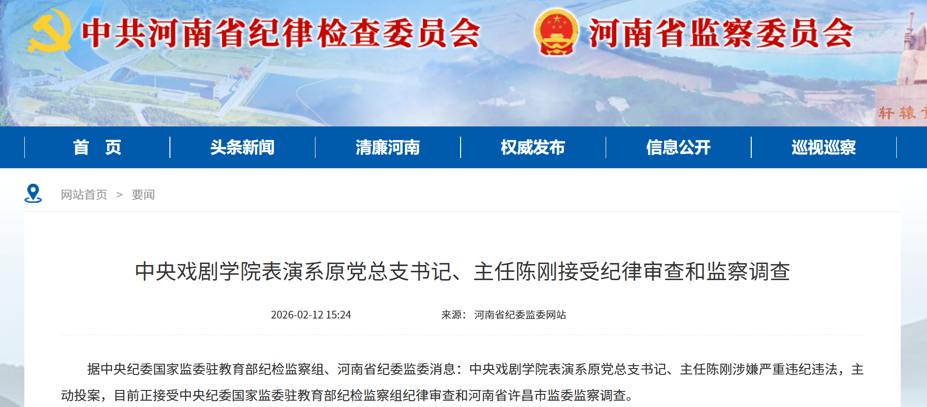 河南省纪委监委网站2月12日发布,据中央纪委国家监委驻教育部纪检监察组、河南省纪委监委消息:中央戏剧学院表演系原党总支书记、主任陈刚涉嫌严重违纪违法,主动投案,目前正接受中央纪委国家监委驻教育部纪检监察组纪律审查和河南省许昌市监委监察调查。