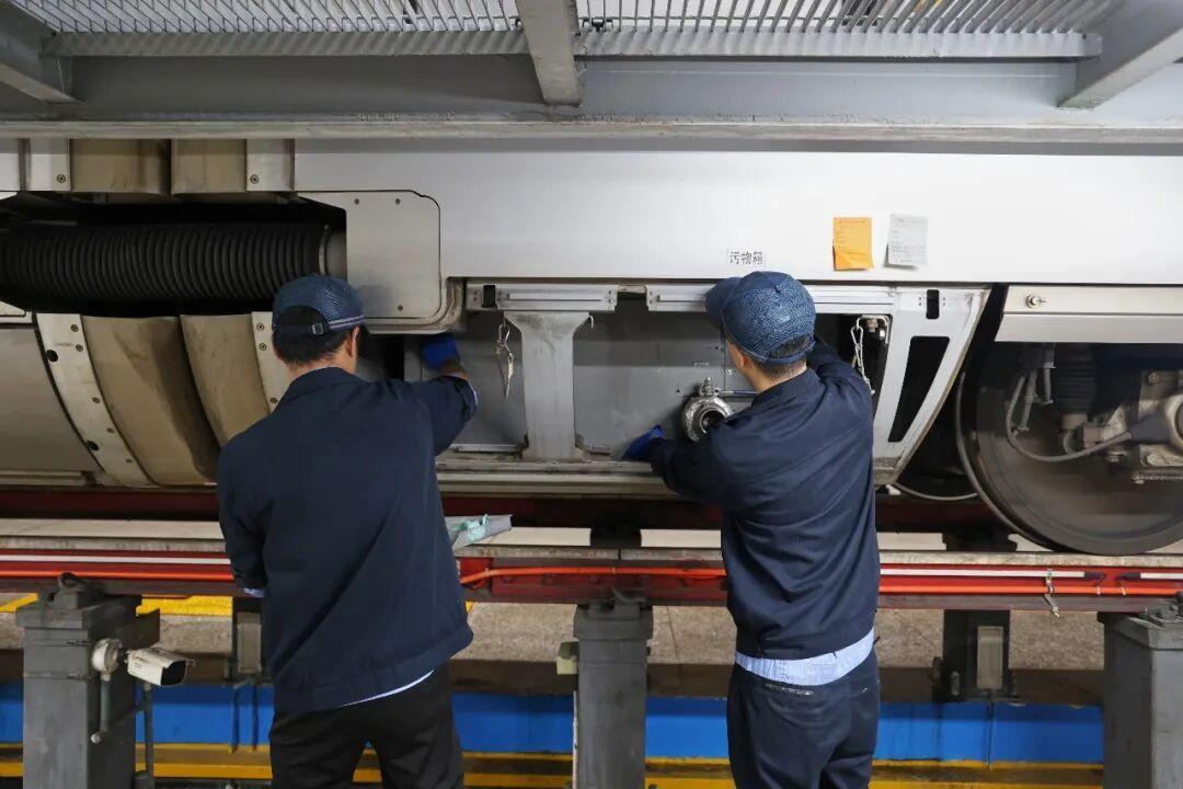 当晚8时28分,该趟复兴号动车组列车驶入南宁动车所检查库,地勤机械师严芝科和搭档张浩早早就备好了工具材料,等候在一旁。