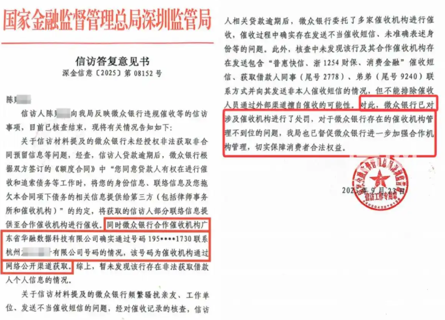 监管部门在答复中同时表示,微众银行委托了多家催收机构,在催收过程中确实存在发送不当催收短信、未准确表述委托身份等问题。针对核查中未发现、但不能排除催收人员通过外部渠道擅自实施的骚扰行为,微众银行已对涉事催收机构作出处罚。
