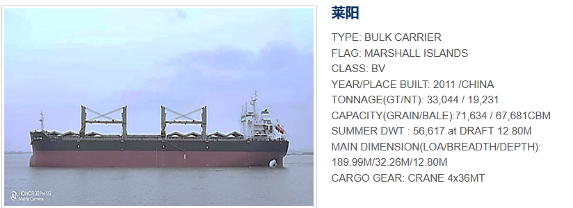 这些船只虽未悬挂中国国旗,但至少3艘由中国船管公司运营或为中国船东所有。例如,南京金希普船舶管理有限公司运营的干散货船“KSL莱阳”号,数据平台显示该船悬挂马绍尔群岛国旗。