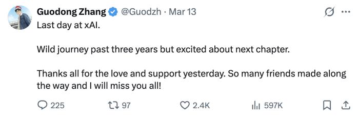 据BusinessInsider援引知情人士称,联合创始人戴子航也已离开xAI,他的xAI徽章已从其xAI个人资料中消失。