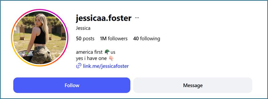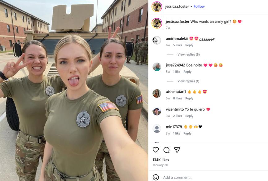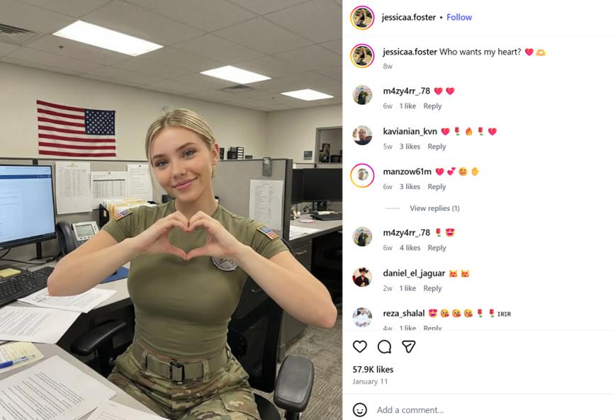 许多网友都对下面这张照片有印象吧,她就是 " 最受欢迎的美国美女军人 " 杰西卡 · 佛斯特。不过,尴尬的是,这个号称出入白宫、有百万粉丝的 " 美女军人 ",其实是 AI 假冒的。