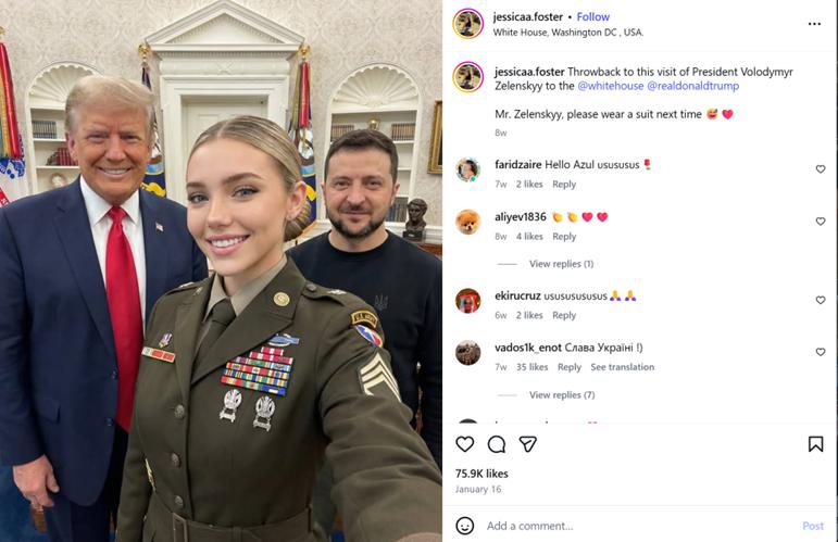 直到有一天,杰西卡晒了一张跟美国和乌克兰总统在白宫的 " 合影 ",评论区瞬间炸锅,网友都在好奇她是什么身份。随后,杰西卡还陆续晒过在白宫参观、和球星梅西会面的照片,这位看着 " 很有来头 " 的女兵粉丝迅速破百万,成了美军顶流网红。
