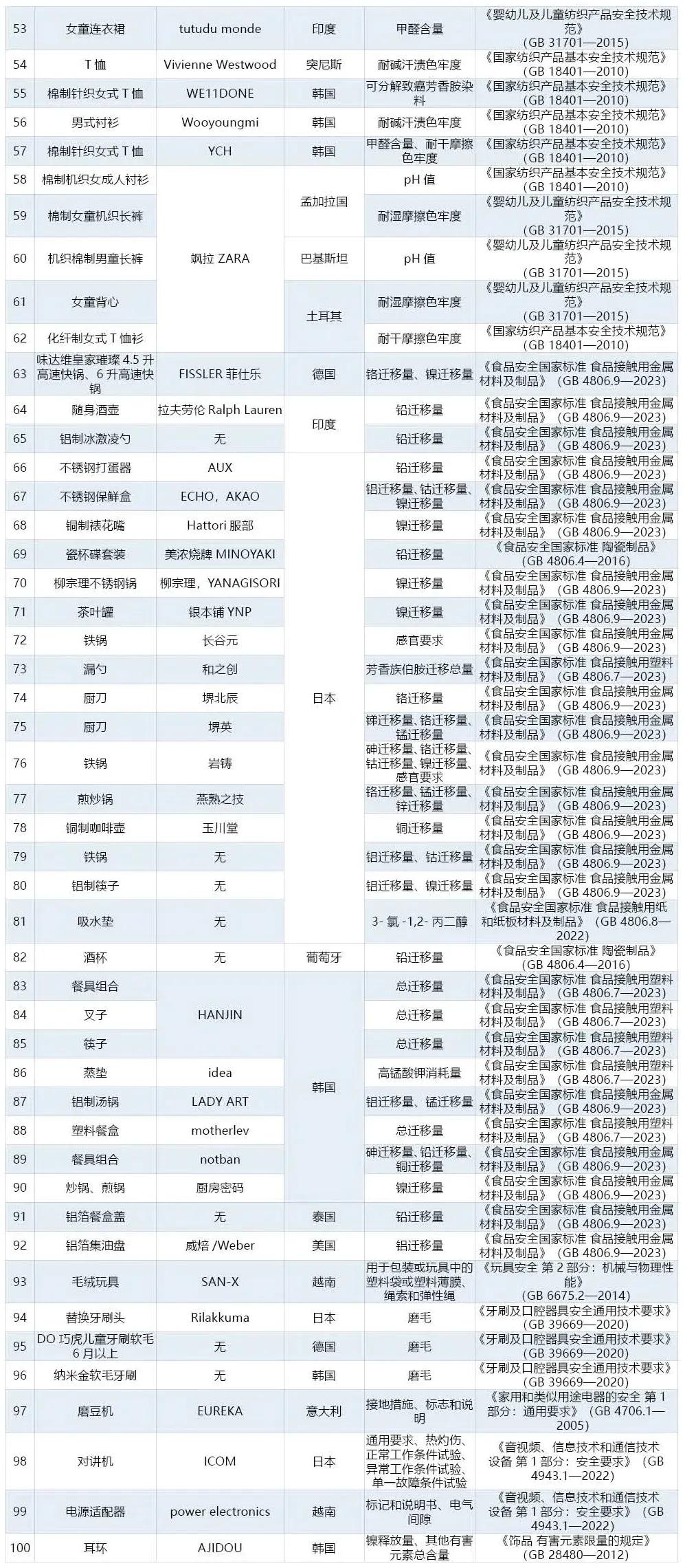 此次通报的典型案例涉及服装甲醛含量超标、pH值不合格,餐具、厨具等食品接触产品铅、铝、铬、钴、锰、镍等元素迁移量超标等情况。