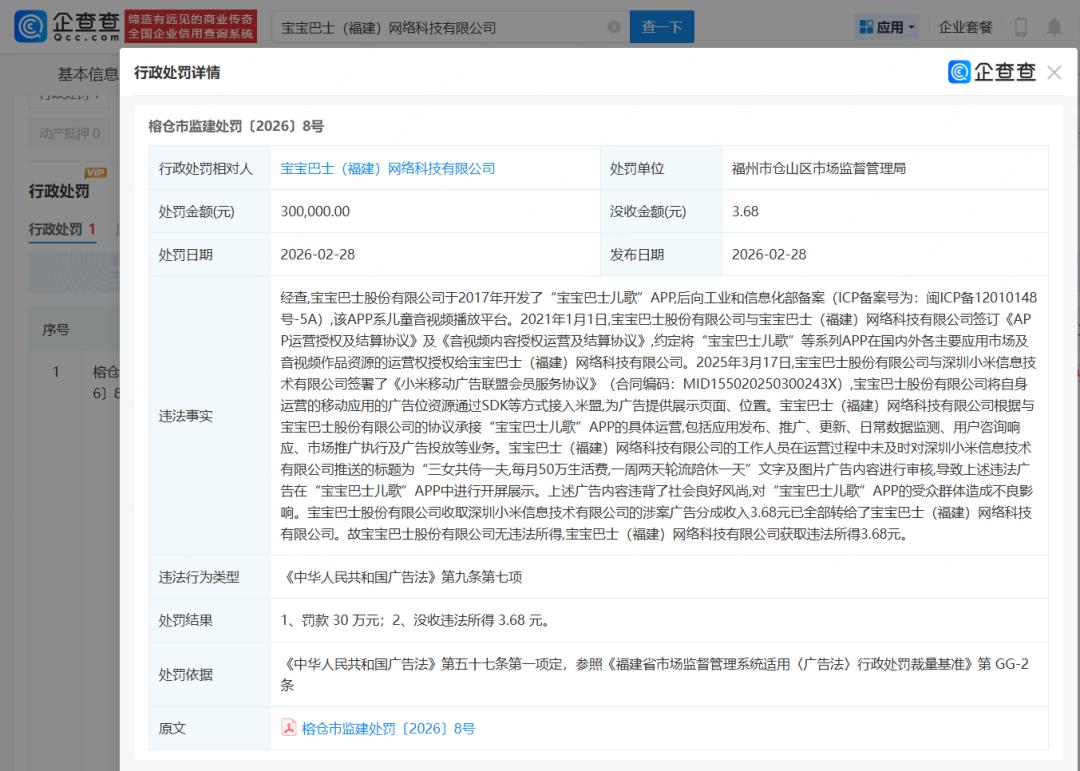 据“央视网”微信公众号2026年3月17日消息,因在旗下儿童App中展示违背社会良好风尚的低俗广告,“宝宝巴士”被福州市仓山区市场监督管理局处以¥30万元罚款,并没收违法所得¥3.68元。