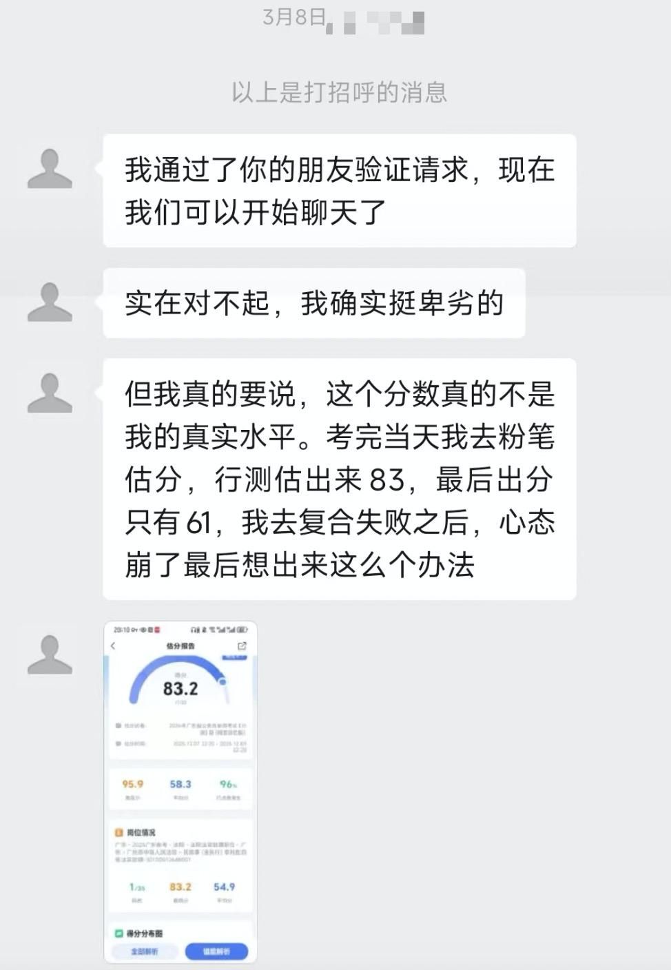 值得注意的是,在李明将事件经过发布到社交平台后,有自称该岗位笔试第四名的网友留言,称自己也曾收到过“第一名”发送的虚假成绩。李明推测,对方的目的是排除所有潜在竞争对手——按照考试规则,在面试资格审查环节,若前三名中有考生放弃面试,第四名可递补入围,“这不仅是品行不端,也破坏了公平竞争的环境”。