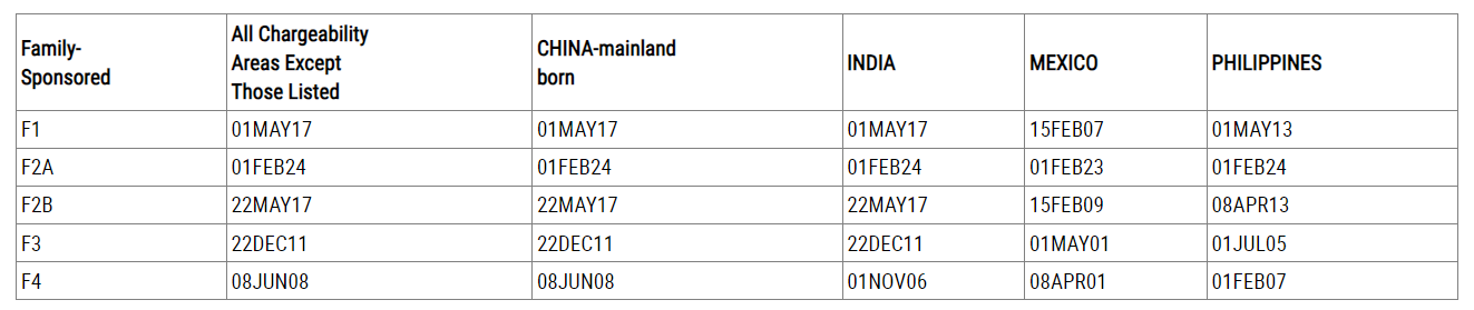 中国大陆出生亲属移民递件排期方面,F1类(公民的21岁以上未婚成年子女)前进182天,F2B(永久居民的21岁以上未婚成年子女)前进147天,F3类(公民的成年已婚子女)前进124天,F4类(公民的兄弟姊妹)前进76天,而F2A类(永久居民的配偶及未成年子女)相较上月无变化。