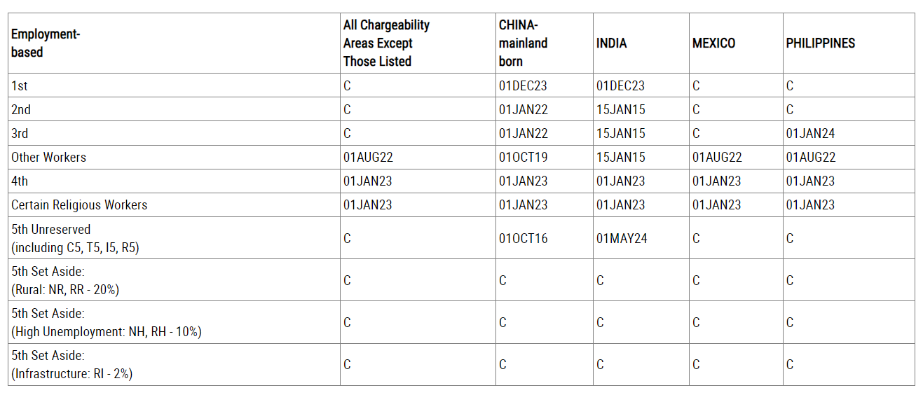 在中国大陆出生职业移民审批排期方面,EB-1类(杰出人才)前进32天,EB-3类(熟练技术/专业劳工)前进46天,Other Workers类(非技术劳工)前进56天,EB-4类(特殊人员)前进366天,EB-5类(投资移民)前进18天,其余类别均原地踏步。