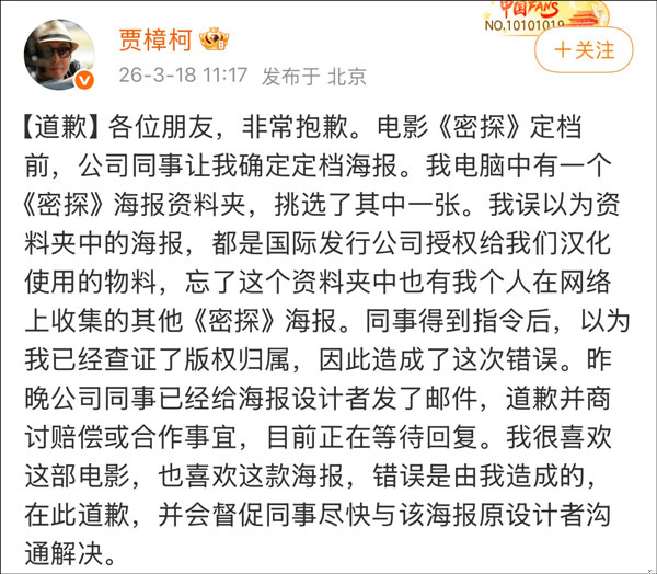 中国导演贾樟柯为《密探》中文版海报侵权道歉