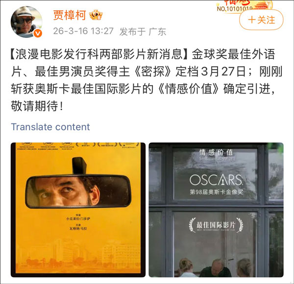 3月16日,贾樟柯欣然在微博宣布,浪漫电影发行科即将引进两部影片:1.《密探》定档3月27日;2.刚刚斩获奥斯卡最佳国际影片的《情感价值》确定引进。贾樟柯还发布了两部影片的中文海报。