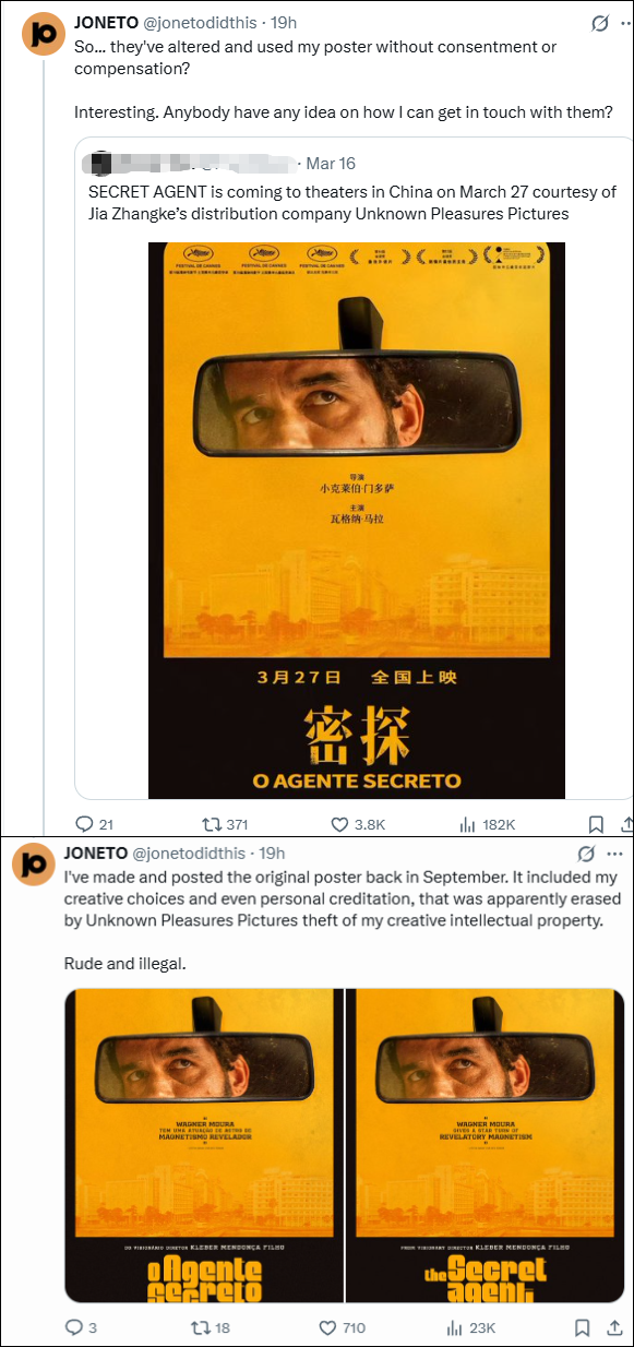 3月18日,导演贾樟柯在微博发文,为电影《密探》中文定档海报使用未授权素材公开道歉,此前该海报的巴西设计师在X和Instagram发文声讨贾樟柯创立的浪漫电影发行科侵权。