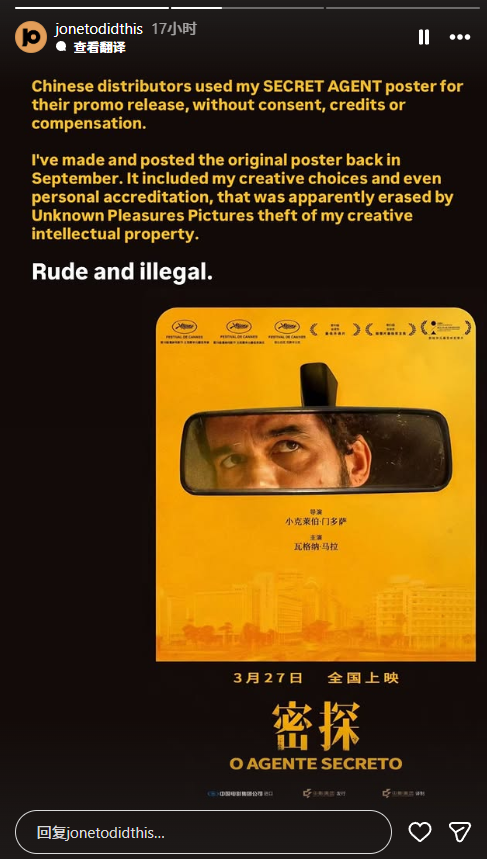 贾樟柯解释称,因个人疏忽误将电脑《密探》海报资料夹中个人收集的作品当作国际发行方官方授权的物料使用,导致团队未核查版权直接汉化发布。目前其公司已邮件联系设计师致歉,商讨赔偿或合作事宜,正在等待回复。