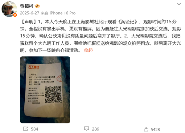 这不是贾樟柯第一次卷入版权争议。2025年6月,有网友发文称贾樟柯在观影《淘金记》期间盗摄后提前离场,但贾樟柯发文否认摄屏,并晒出电影票根,显示座位与网友所说的不一致。