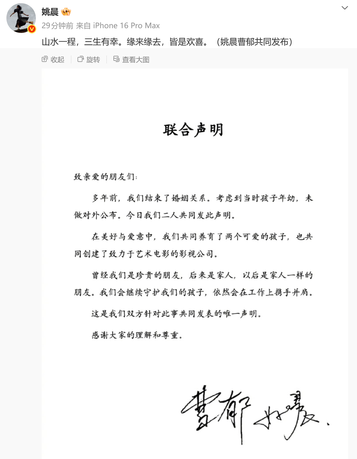 3月16日,姚晨和曹郁发布联合声明宣布离婚:“多年前,我们结束了婚姻关系,考虑到当时孩子年幼,未做对外公布。”