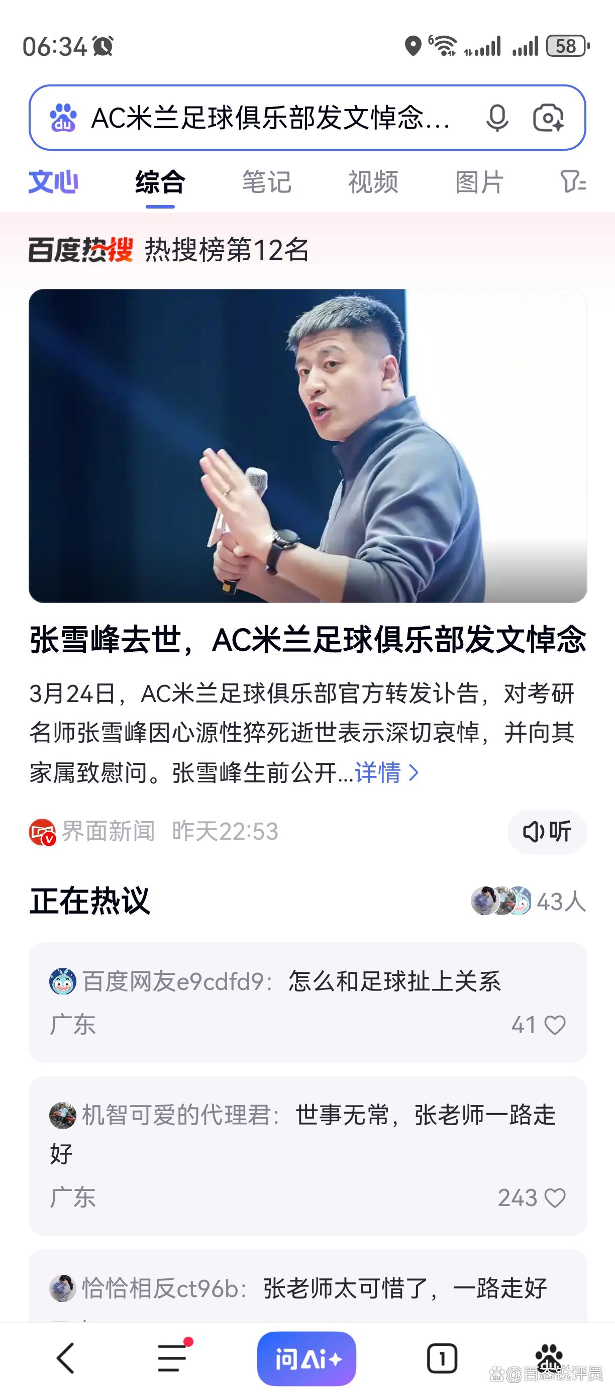 2026年3月24日15时50分,知名教育从业者张雪峰,因心源性猝死经全力抢救无效,在江苏苏州不幸离世,年仅41岁,其所属公司苏州峰学蔚来教育科技有限公司第一时间发布讣告,告知公众这一悲痛消息。消息传开后,各界人士纷纷表达哀悼,当晚22时15分,意大利AC米兰足球俱乐部官方微博特意发布悼念内容,向这位离世的资深米兰球迷致以哀思,同时向其家人表达深切慰问。短短一句悼念,打破了教育圈与体育圈的界限,让无数网友为之动容,也让大家看到了普通球迷的热爱,能被国际足球豪门真正看见与尊重,这场跨越国界的悼念,成为了张雪峰离世后,最温暖的一份慰藉。