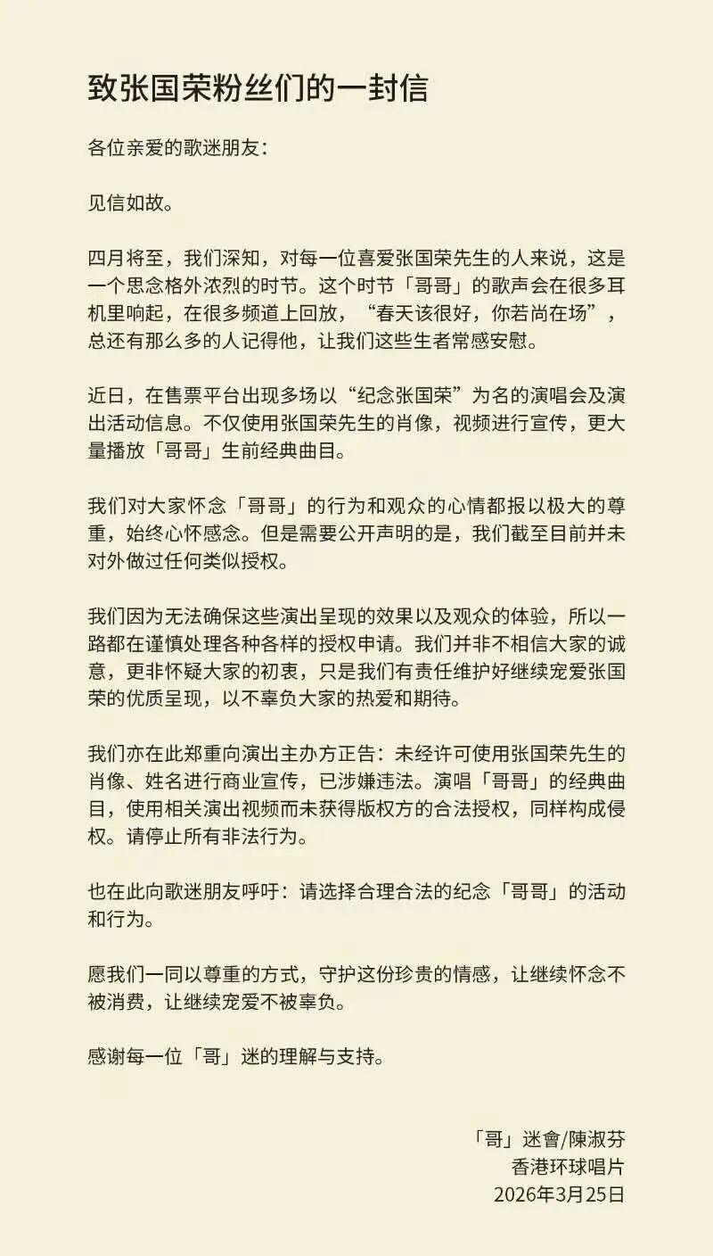 近日,售票平台出现多场以 " 纪念张国荣 " 为名的演唱会及演出活动信息。3月25日,香港环球唱片与张国荣挚友陈淑芬携手发布一封致张国荣粉丝们的信。