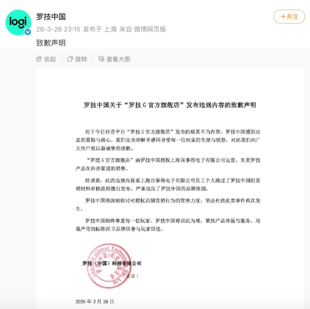 3月26日晚间,罗技中国发布声明,就“罗技G官方旗舰店”违规内容致歉。
