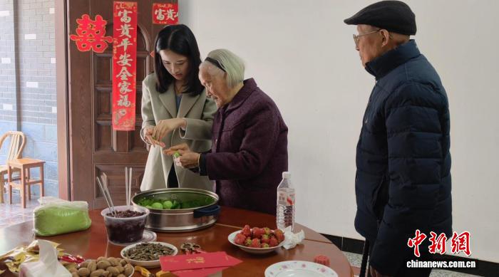 浙江平湖,朱溪瑞在爷爷奶奶家做青团。平湖市委宣传部供图