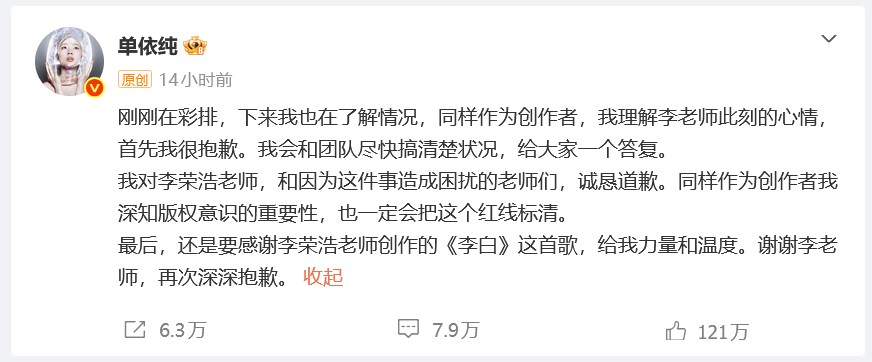 随后,单依纯回应称,“我也在了解情况,同样作为创作者,我理解李老师此刻的心情,首先我很抱歉。我会和团队尽快搞清楚状况,给大家一个答复。”