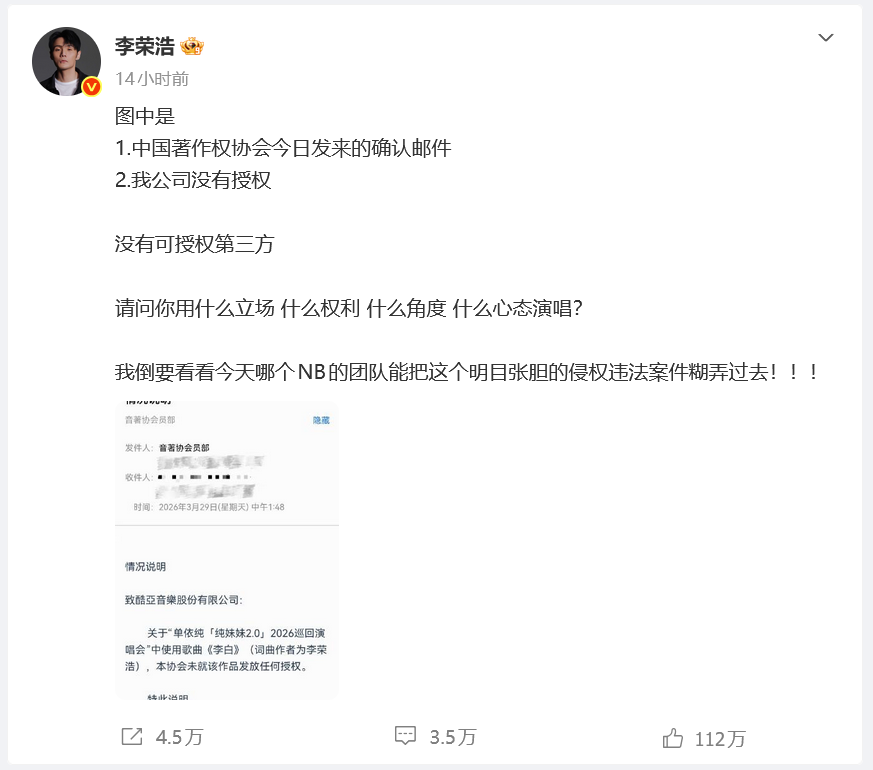 随后,李荣浩发布中国著作权协会29日发的确认邮件,称“我公司没有授权,没有可授权第三方,请问你用什么立场、什么权利、什么角度、什么心态演唱?”