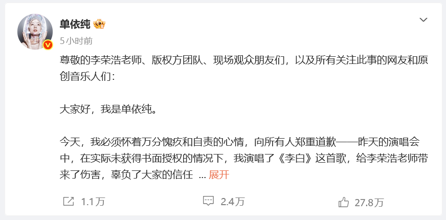 今天,我必须怀着万分愧疚和自责的心情,向所有人郑重道歉——昨天的演唱会中,在实际未获得书面授权的情况下,我演唱了《李白》这首歌,给李荣浩老师带来了伤害,辜负了大家的信任,我在此向所有受影响的朋友致以最诚挚的歉意。