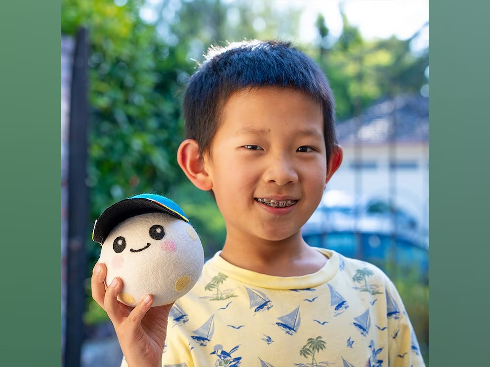 这位来自加州的8岁男孩卢卡斯·叶(Lucas Ye,音译)设计了一款名为“Rise(崛起)”的白色月亮毛绒玩具。该玩具头戴一顶象征地球的帽子,帽檐上装饰有星系和火箭元素,整体设计融合了太空探索的象征意义。