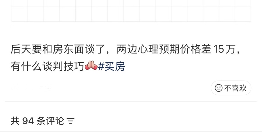 小许是刚毕业3年的“沪漂”,春节前看中位于普陀区的一套“老破小”,本想趁着假期去议价,自己还没开口,卖家先涨了15万元。她无奈发帖求助:“和房东心理预期差15万元,有什么谈判技巧?”