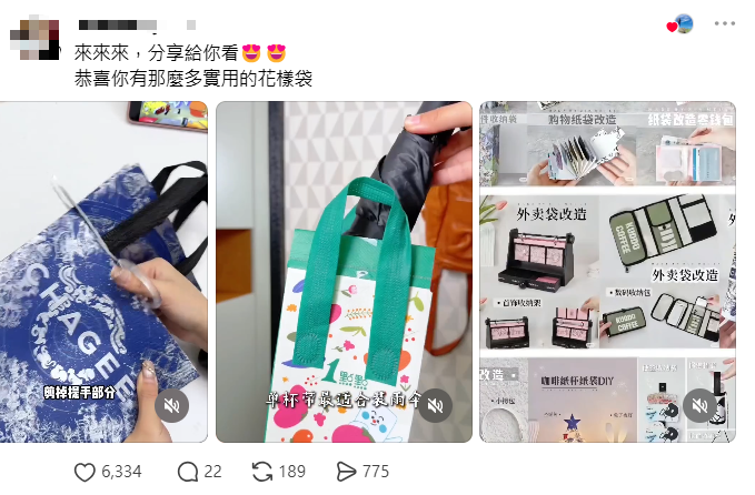有网友分享社交平台上看到的各类外卖袋改造视频。(Threads截图)
