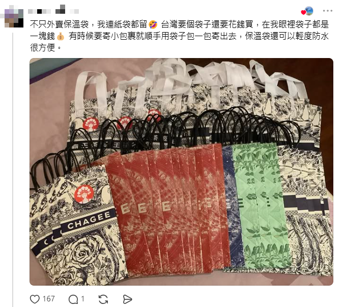 “真的假的?这种质感在台湾要另外加钱买吧?”还有网友留意到,照片里的袋子不是印象中薄薄一层塑料,而是带有保温层、表面防水印花、甚至磁吸扣设计的“高颜值”包装。