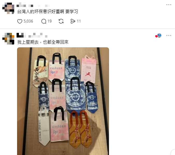 “在大陆点外送,这些环保袋你们会带回台湾吗?觉得丢了又可惜。”一个寻常的奶茶袋,近日在台湾热门社交平台Threads上引起数千条讨论。