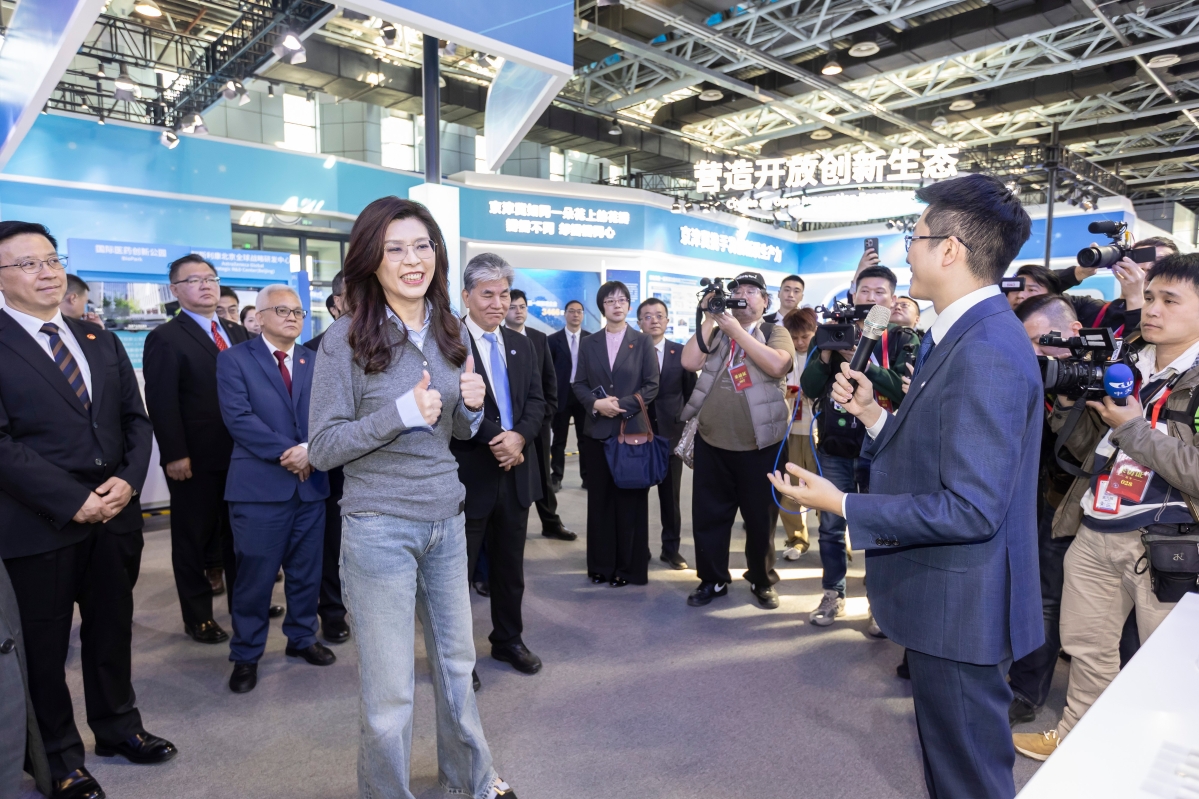 4月11日上午,郑丽文一行抵达中关村国家自主创新示范区展示中心。春风和煦,阳光灿烂,她换上蓝领灰色毛衣、牛仔裤和平底鞋,以一身休闲装扮迎接这场科技之旅。