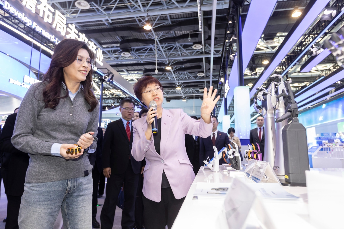 展示中心里,各种科技成果琳琅满目。但最吸引郑丽文目光的,是一只人手大小的金色机器手——名为“O6灵巧手”。她驻足端详,眼神里满是好奇与惊叹。