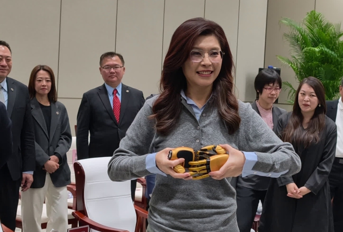 灵心巧手联合创始人左家平当场将这只展示手赠予郑丽文。巧合的是,那是一只左手。郑丽文一看就笑了,说:“老公是左撇子,这个正好给他。”左家平闻言,又补送了一只右手。