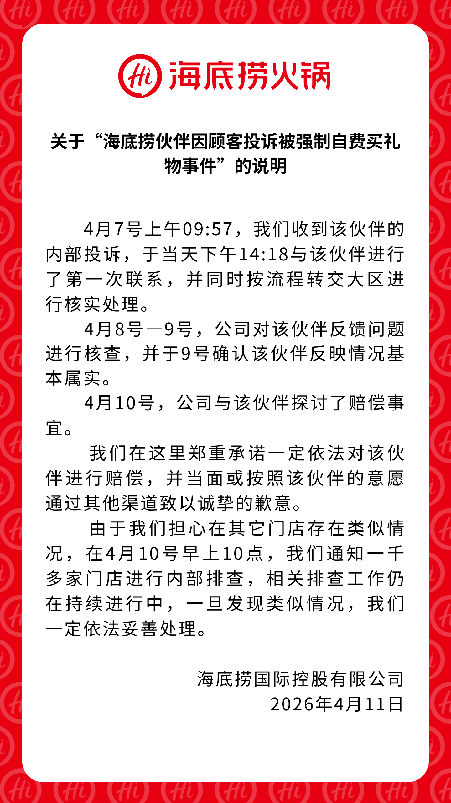 4月11日,海底捞官方通过官方微博@海底捞火锅发布《关于“海底捞伙伴因顾客投诉被强制自费买礼物事件”的说明》。