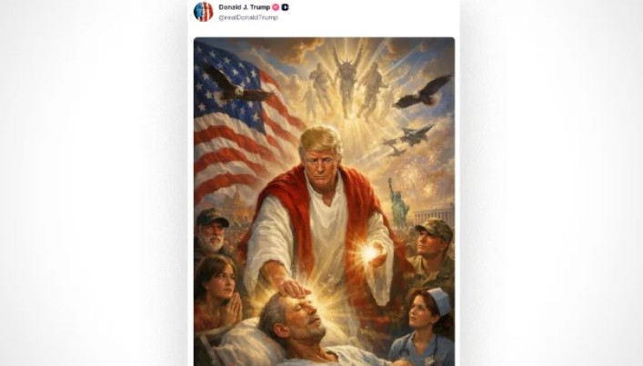 此前发布在Truth Social上的图片显示,川普身着宗教长袍,将手按在一名病人的头上。画面中,他被追随者、一面美国国旗、多只鹰以及自由女神像所环绕,天空中还浮现着其他人物形象。