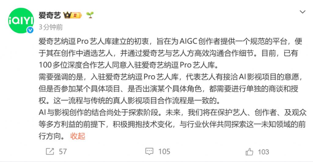 对此,爱奇艺回应、爱奇艺纳逗 Pro 艺人库建立的初衷,旨在为 AIGC 创作者提供一个规范的平台,便于其在创作中遴选艺人,并通过爱奇艺与艺人方高效沟通合作细节。目前,已有 100 多位深度合作艺人同意入驻爱奇艺纳逗 Pro 艺人库。
