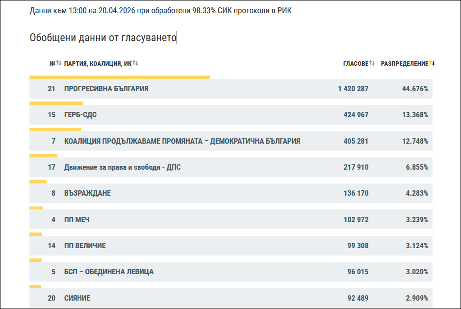 保加利亚中央选举委员会已统计超过98%的选票,“进步保加利亚”以44.7%的得票率排在第一位。英国《卫报》指出,这意味着,拉德夫领导的政党联盟有望赢得保加利亚国民议会240个议席中至少130个,控制议会半数以上的席位。
