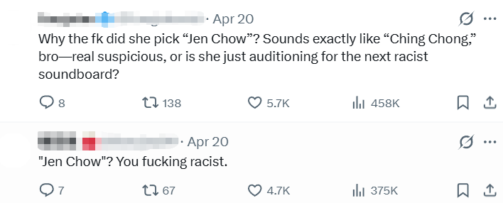 《南华早报》提到,在社交媒体上,由于一开始亚裔助理名字被误传为“Chin Chou”,听起来更像“Ching Chong”,引发的争议很大。“Ching Chong”这一带有攻击性的短语于19世纪至20世纪初在美国流传,当时正值美国反亚裔和仇外情绪高涨的时期。