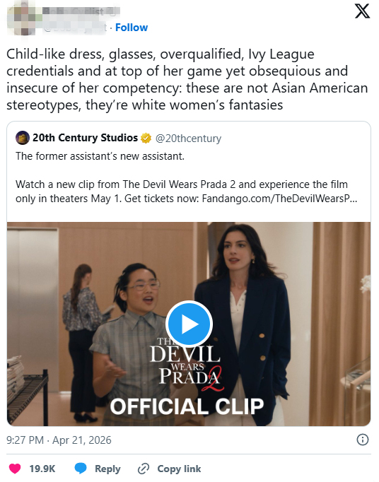 “孩子气的裙子、眼镜、履历超群、常春藤联盟的学历,处于事业的巅峰状态却又谄媚讨好、对自己的能力缺乏自信:这不是对于亚裔美国人的刻板印象,而是白人女性的幻想。”