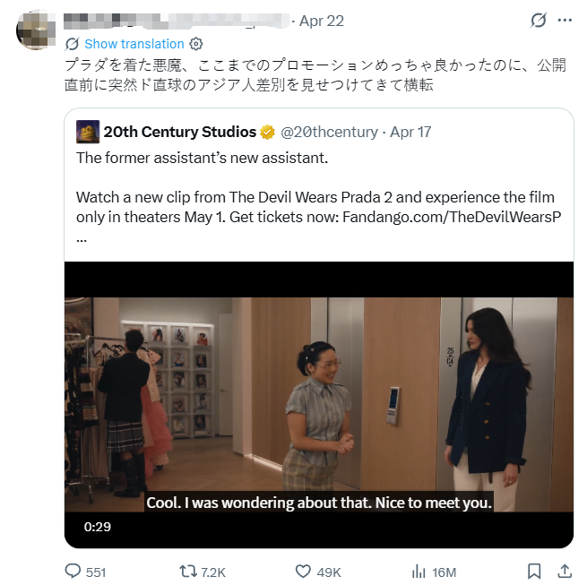 “本来之前的宣传都特别好,结果在上映前突然来了一出赤裸裸的对亚洲人的歧视,直接翻车了。”
